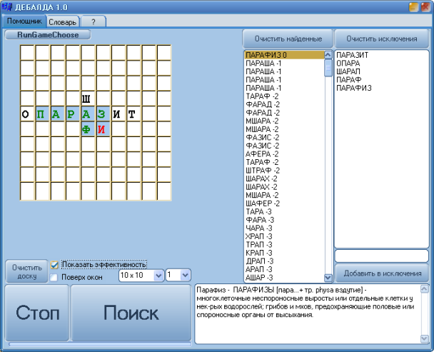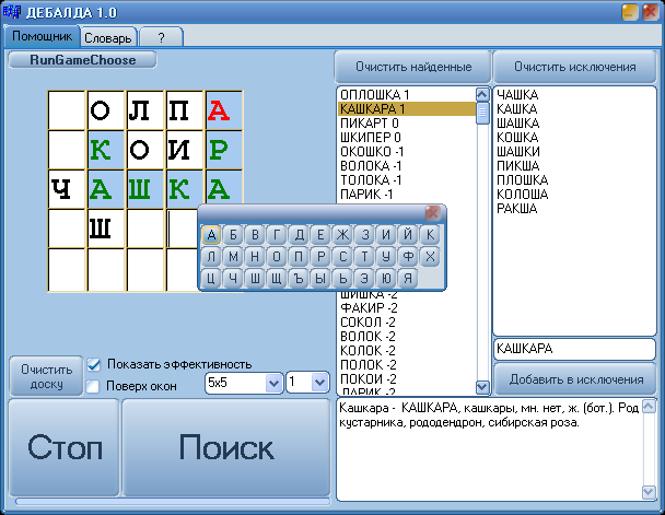 Все параметры, на которых нет никаких обозначений, снабжены всплывающими подсказками, для их вызова задержите курсор мыши над данным параметром. Для поиска возможных вариантов решение – введите первое слово, которое обычно расположено по горизонтали в центральных ячейках. Ввод букв очень прост, мышкой вставляем курсор в необходимую позицию и вводим нужную букву, далее с помощью клавиши ENTER или TAB переходим не следующую ячейку, либо с помощью мыши выставляем курсор в нужную позицию и так далее, пока не будет введено все слово. Двойной клик по ячейке вызывает виртуальную клавиатуру, что позволяет не использовать «реальную» клавиатуру в этом случае. При необходимости, вводим текст в поле «слово исключение» и нажимаем кнопку «добавить в список исключений» добавится слово, которое не будет предлагаться в качестве решения. Далее при необходимости ставим галочку «Показать эффективность хода» и выбираем глубину расчета эффективности. Этот параметр может серьезно замедлить работу программы на маломощных компьютерах, поэтому определите максимальный из подходящих значений именно для вашего компьютера. Параметр «Глубина расчета эффективности» позволяет выбирать наиболее эффективные ходы и возможность выигрывать в особенно «тяжелых» случаях. Чем больше величина этого параметра, тем эффективнее выбирается ход, но обратная сторона - это то, что больше тратиться времени на его вычисление. Оптимальным значением этого параметра является четверка, что позволяет быстро найти эффективность даже на маломощных компьютерах. Далее нажимаем кнопку «Поиск» после чего начинается поиск возможных вариантов решения, найденные слова добавляются в список найденных слов. Список найденных слов отсортирован в порядке эффективности выбора данного слова, т.е. в самом верху списка находится самое эффективное слово, справа от слова цифра его эффективности, чем больше эта цифра, тем более эффективен ход, отрицательные цифры говорят о ходах, которые ухудшат вашу ситуацию. Клик по слову из списка показывает на поле расположение найденного слова, выводит его описание и добавляет найденное слово в поле, из которого его можно добавить в слова исключения, двойной клик по найденному слову делает все описанное выше, но уже с добавлением в слова исключения. Для того чтобы убрать выделение хода, выберите последнюю, пустую строку в списке найденных слов. Чтобы удалить слово из исключений выберите данное слово, и нажмите на клавиатуре клавишу «Delete». Остальные функции («СТОП», «очистить …»), на главное окне программы не должны вызвать трудностей и носят «говорящие» обозначения.